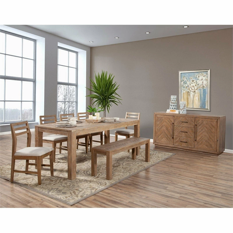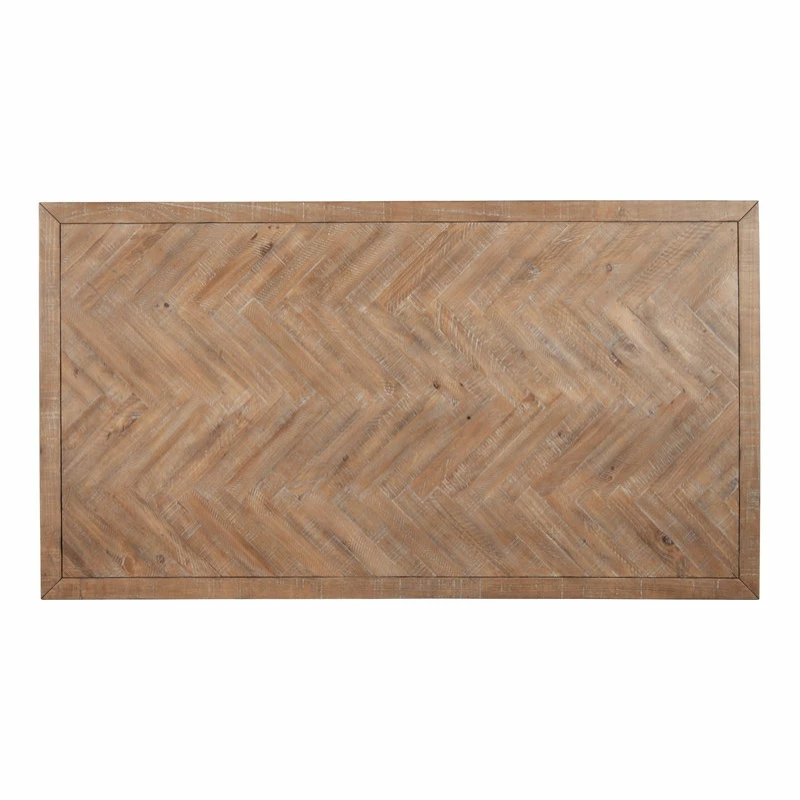 The Aiden collection creates an enticing atmosphere in your dining room that reflects a fashionable take on a rustic style. Rendered in a Natural Weathered (Brown) finish on Pine solids, this dining set embodies traditional character with a cool and casual attitude. The tabletop feature an inlaid chevron pattern. Coordinates with other pieces from the Alpine Furniture Aiden dining group.