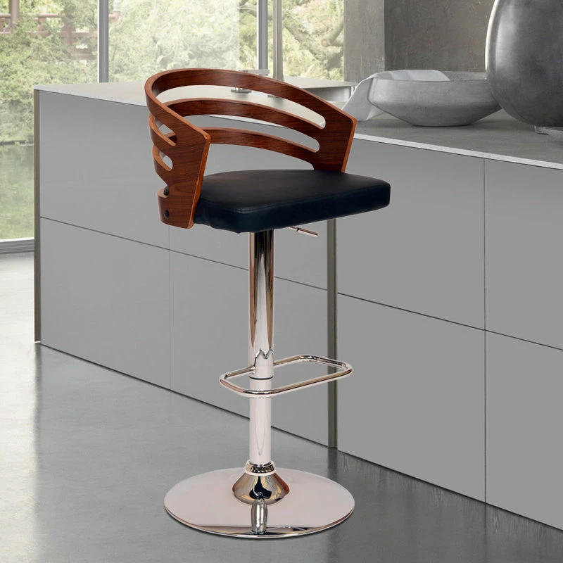 The Armen Living Adele Adjustable Height Swivel Black Faux Leather and Walnut Wood Bar Stool with Chrome Base is the perfect addition to your home. The adjustable seat height functionality allows you to use this kitchen stool at your home bar, kitchen island, or peninsula without having to worry about the surface height. The convenient swivel function optimizes everyday use or entertaining, keeping everyone engaged regardless of their place in the room. The plush padded seat with high-density foam will provide you with all-day comfort. The curved wood back is ideal for posture alignment and an unmatched support for days on end. The foundation of the product is supported by wood and features a metal footrest for a chic and stylish aesthetic without comprising practicality and functionality of this item. The mid-century silhouette exudes timeless beauty that will last for many years to come. The Adele is available in multiple color options, featuring a walnut wood back with your choice of black, cream, or grey faux leather upholstery with a Chrome base or a black wood finish with your choice of grey faux leather and a black base or grey faux leather and a chrome base.