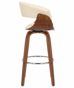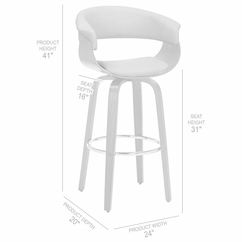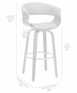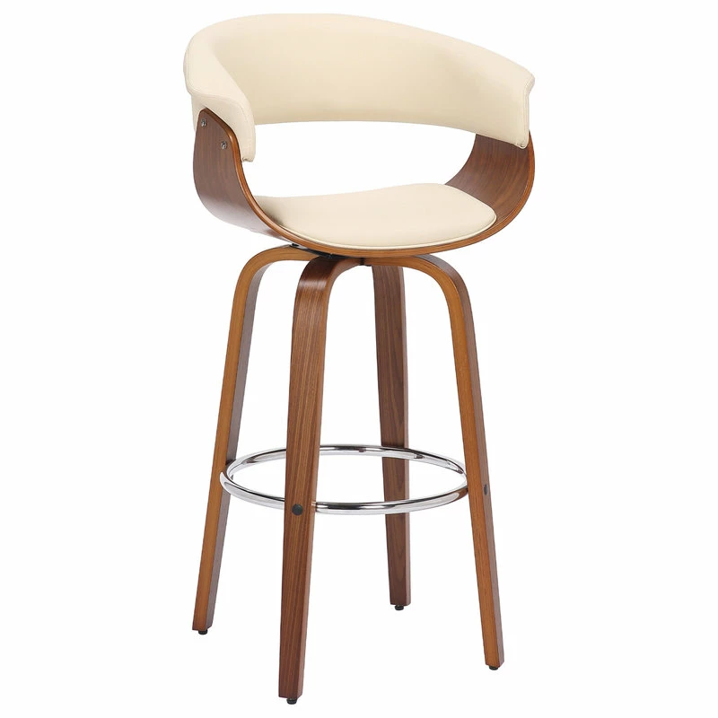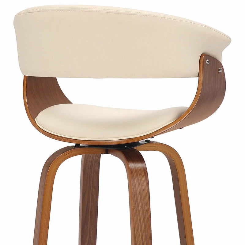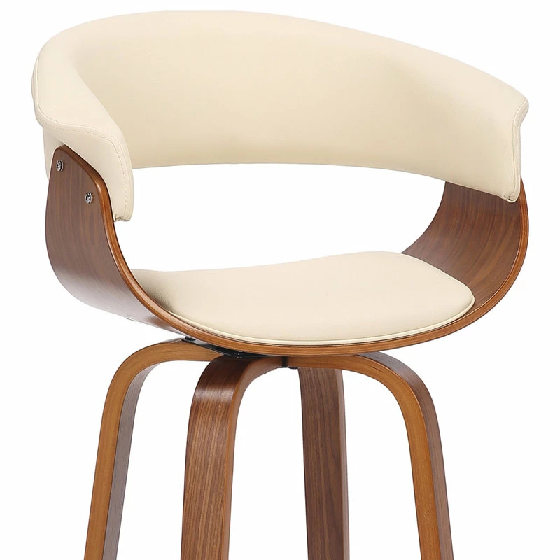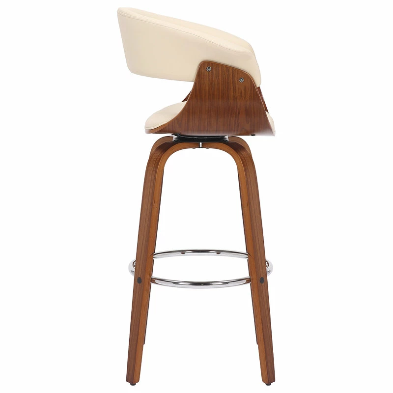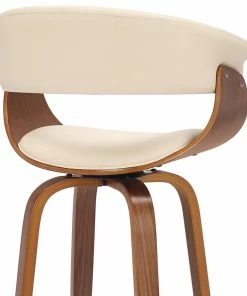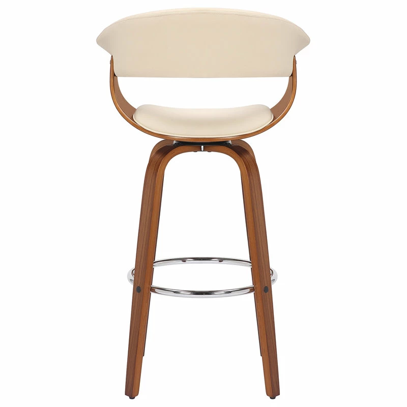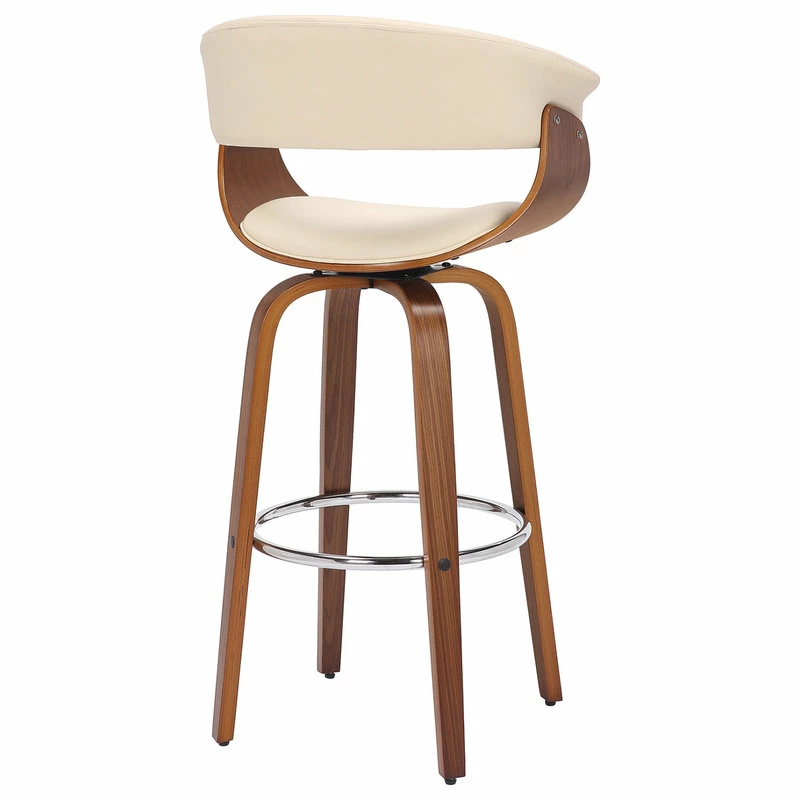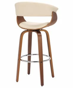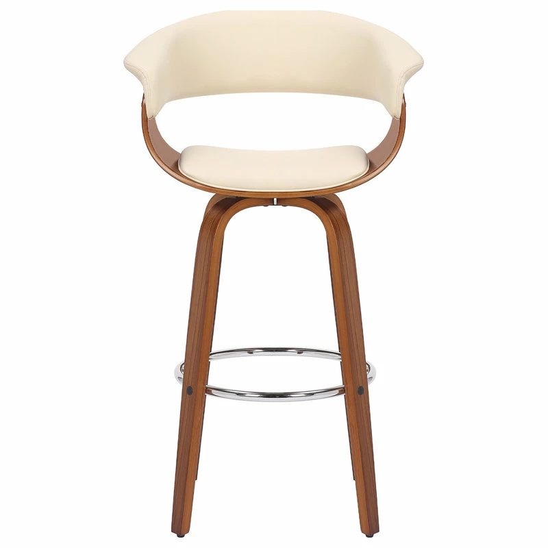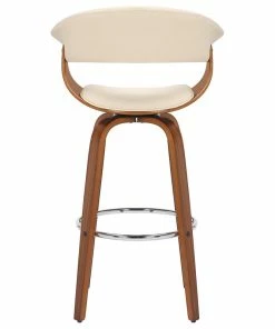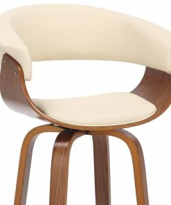 The Armen Living Julyssa 30″ Bar Height Swivel Cream Faux Leather and Walnut Wood Bar Stool is a standout in any home regardless of the existing design theme. The beautiful frame is constructed from wood and is accented by its beautiful faux leather upholstery that runs across the seat and back. The high-density foam cushioned back, and seat allow you to sit or entertain comfortably.The mid-century modern style silhouette of this stool creates a timeless look that will last for many years to come. The Julyssa Bar or Counter Stool is available in your choice of a Walnut Wood finish with Brown or Cream faux leather upholstery or a Black Wood finish with Grey faux leather upholstery and your choice of a 26″ or 30″ seat height.Features