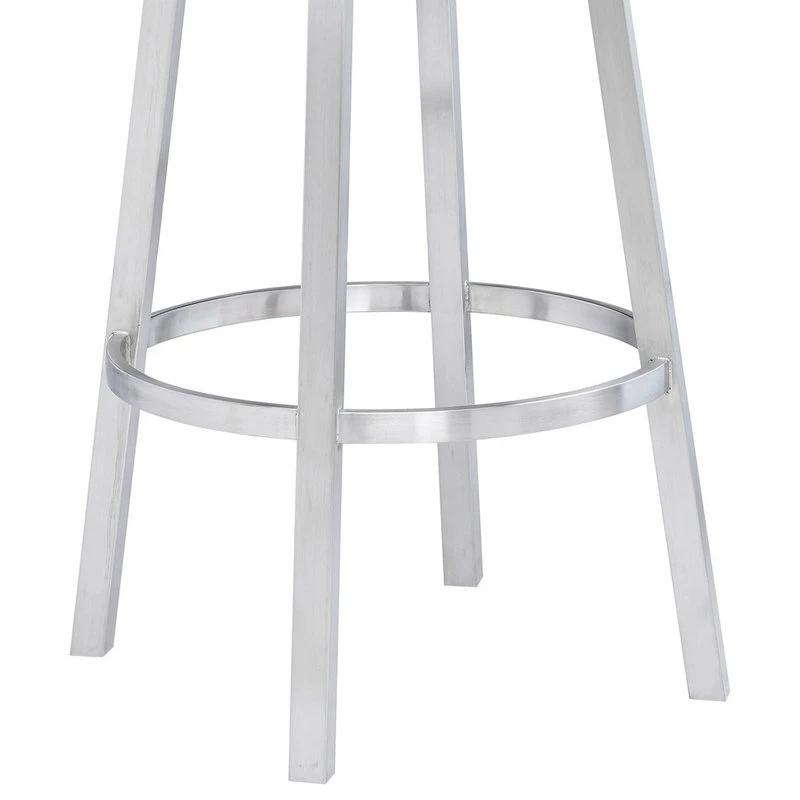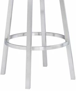 The Armen Living Madrid armless bar stool features a unique aesthetic that is certain to work well in any modern household. The Madrid’s durable brushed stainless-steel frame is accompanied beautifully by its faux leather seat and back. The upholstered low back is rounded, providing the user with exceptional support while the 360 degree swivel seat allows for enhanced mobility. The Madrid’s contemporary straight leg design endows the barstool with a chic quality that is further accented by the inclusion of a round footrest. The Madrid’s legs are tipped with floor protectors, assuring that the bar stool will not slip on or scratch hardwood or tile floors. The beautiful Madrid is available in two industry standard sizes: 26 inch counter and 30 inch bar height and comes with a stainless steel finish and your choice of grey, white, black, red, blue, or green faux leather upholstery.