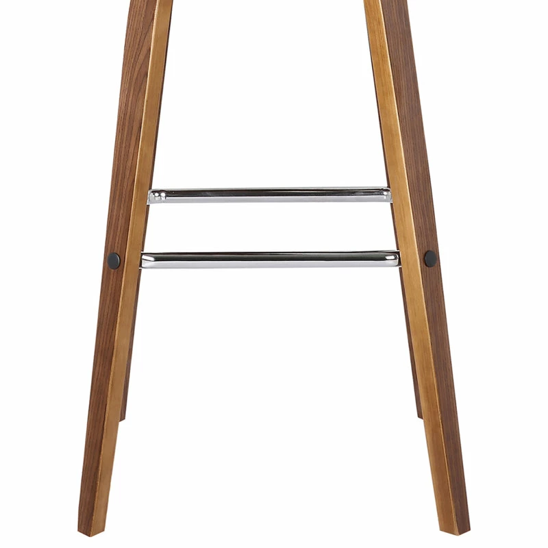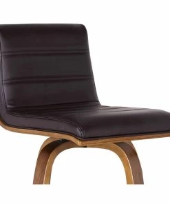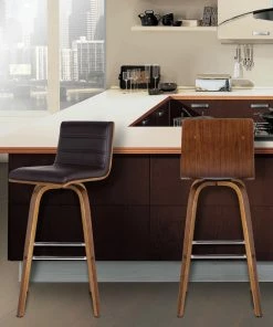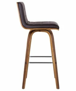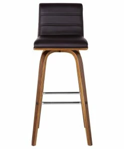 The Vienna 26″ Swivel Brown Faux Leather and Walnut Wood Counter Stool by Armen Living provides both versatile style and comfort with a Mid-Century Modern design that can easily be integrated into your home’s current d๏ฟฝcor. The 360-degree swivel function provides optimal mobility so you and your guests to stay engaged regardless of your place in the room at parties and gatherings. The Vienna๏ฟฝs frame is constructed of strong wood that is brilliantly accented by the plush high-density foam cushion that๏ฟฝs wrapped in faux leather upholstery. A square metal footrest is added for a chic and stylish aesthetic without comprising practicality and functionality of this item. The soft faux leather upholstery makes clean up a breeze, making this the perfect bar or counter stool for any entertaining home! With multiple bar seat height options and the armless design, you can easily pull the Vienna up to your kitchen island, peninsula counter, or home bar. The high seat back ergonomic properties to keep your back healthy and properly aligned. The Vienna is an ideal addition to any home or apartment and its quality materials ensure a comfortable seat for many years to come. The Vienna Counter or Bar Stool is available in 26๏ฟฝ or 30๏ฟฝ seat height and comes in your choice of a walnut wood finish with cream, grey, or brown faux leather or a black wood finish with grey faux leather.