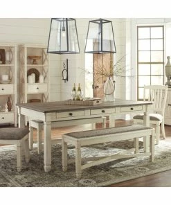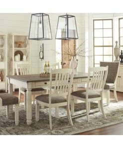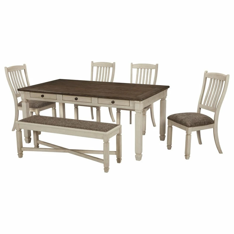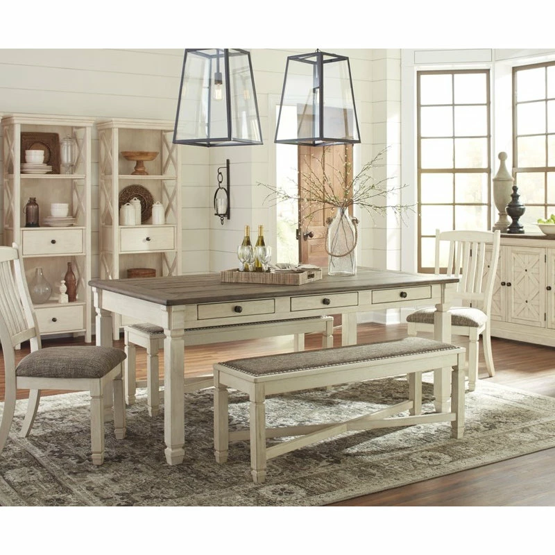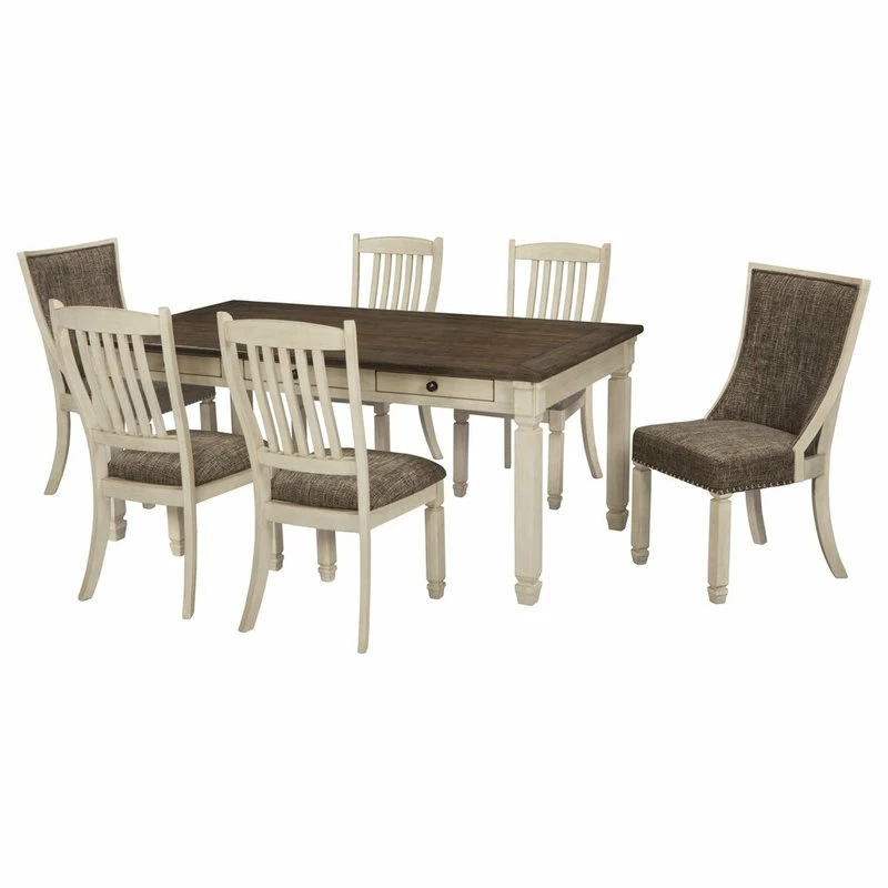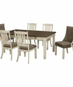 Unique two-tone finish with a combination of Oak and Acacia substrates combining a trendy textured antique white color with table and server tops finished in a textural weathered oak finish. Rectangular dining table features six convenient drawers for storing smaller items. The -02 upholstered host chair inspired by the trendy deconstructed styles for casual living. The -01 side chairs feature a boxed cushion seat. All chairs feature a heavy woven fabric for added textural qualities. The large capacity server has three doors with lattice design. The tall bunching unit has two drawers, three shelves and open lattice sides.
