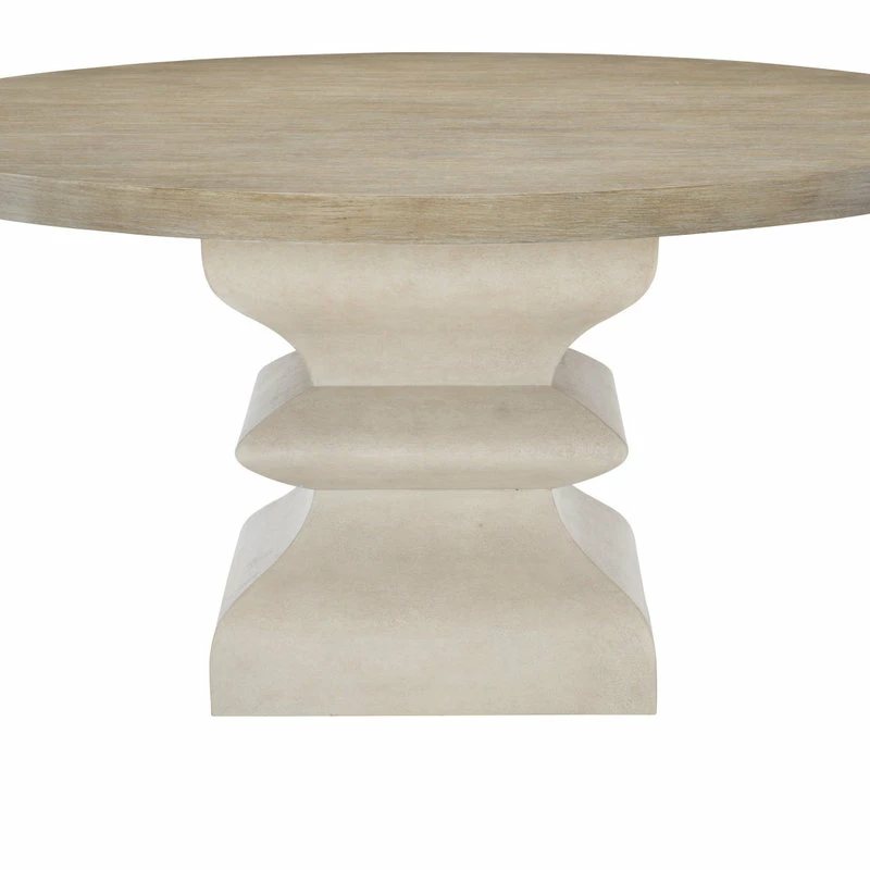 This round dining tables cuts out corners, creating a more intimate space. An oak veneer top in a Textured Cameo finish sits upon a gracefully turned cast pedestal base in faux stone. With its stunning geometry and balance, this table will be the centerpiece of any dining room.
