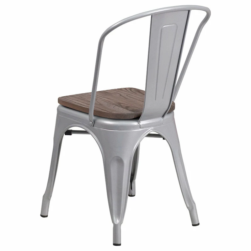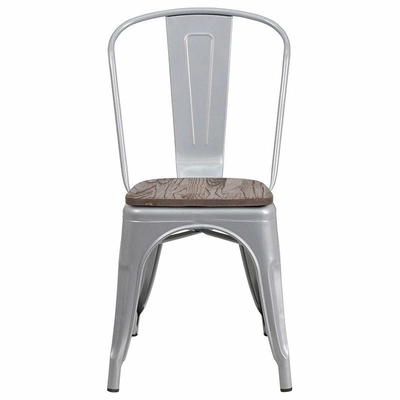 This rustic-chic, bistro stack chair will transform your dining room or restaurant space. Chair is lightweight and easily stacks for storing. A cross brace underneath the seat adds extra stability and features plastic caps that prevent the finish from scratching when stacked. Move chairs around easily without scratching your floors with the protective floor glides. Designed for both commercial and residential use, you can liven up your kitchen, dining room or bistro with this modern-rustic style chair. [CH-31230-SIL-WD-GG] Overal Dimensions: 18″W x 20″D x 33″H