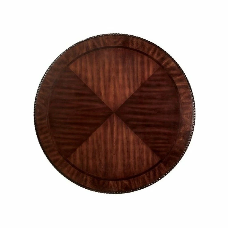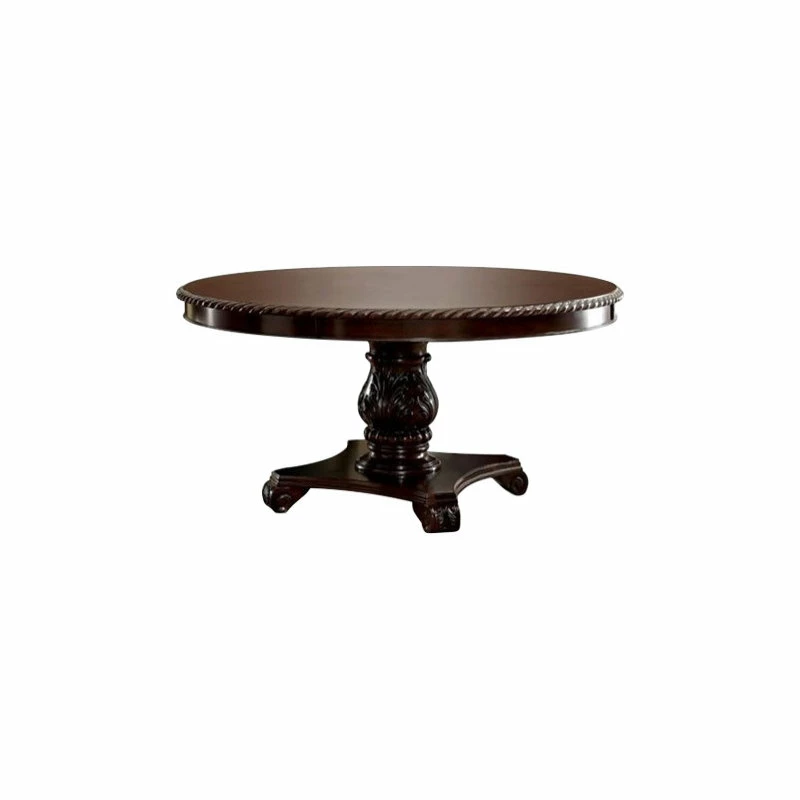 If your dining room could use an elegant upgrade, look no further than this exquisite, round Ramsaran dining table. This traditional table is expertly crafted with solid wood and wood veneer with elaborate, carved designs. A brown cherry finish adds rich, warm depth to this opulent design. Pair this table with chairs and server for the ultimate formal dining room.