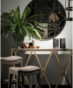 The Gabby Vivian Saddleseat Seat Bar Stool is a casual western-style set made of sturdy solid oak. It pairs a linen-blend fabric with a traditional shape and antique brass nailhead accents. Pieces by GABBY take classic designs and tailor them to the home of today.
