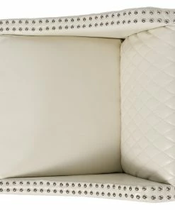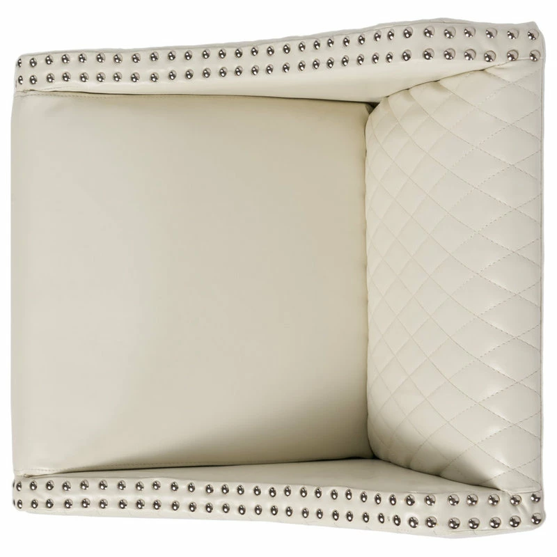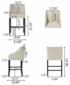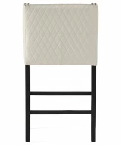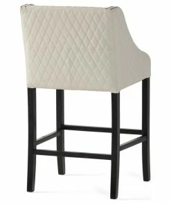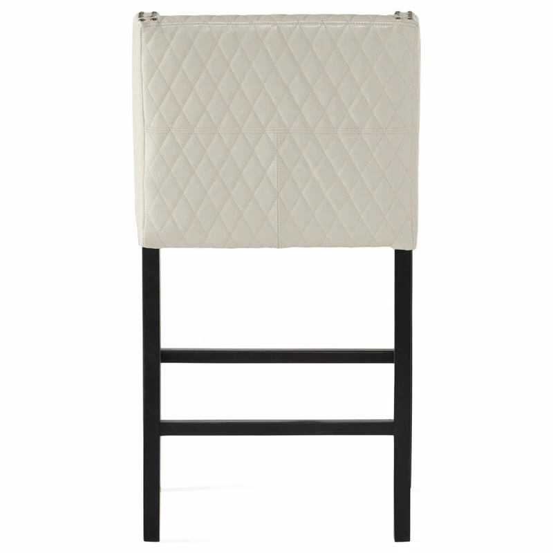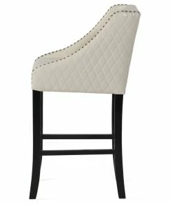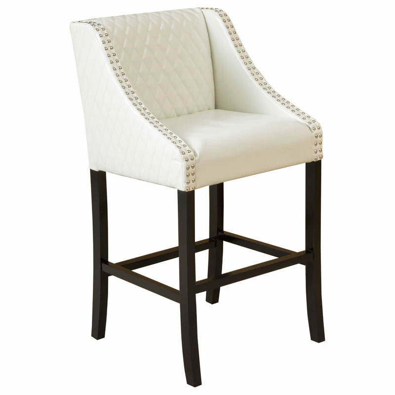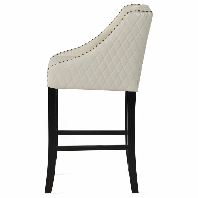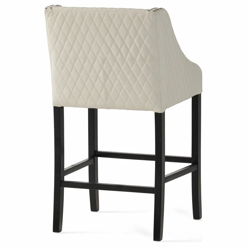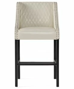 Helping to match your kitchen decor with your living room style, this counter stool is the perfect piece. It features luxurious ivory quilted bonded leather paired with dark wooden legs. The adjacent armrests are unique while not being intrusive to the comfortable width of the seat. Quilting in the leather offers fabulous style and additional comfort and the curved edges are perfectly complemented with chrome studded accents.