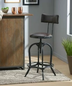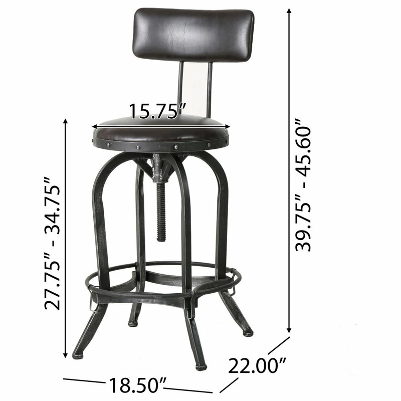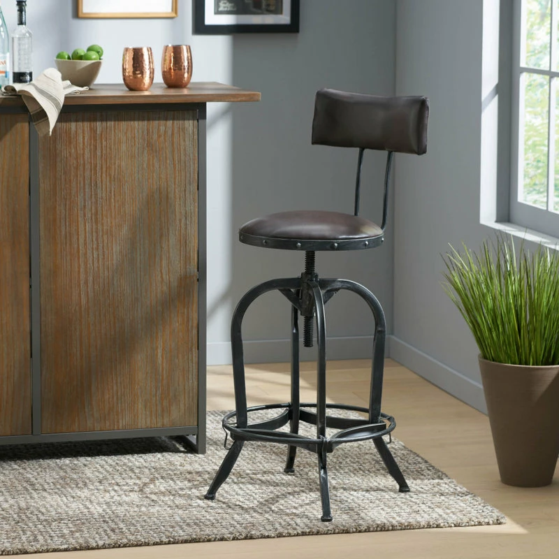 Bring an edgy yet sophisticated atmosphere to your kitchen or bar space with the perfect seating addition. Our barstool offers an exceptional industrial modern appeal for any space with its wrought-iron frame and upholstered seating. Ideal for those who have a variety of guests, this seat offers adjustable and swivel functions for easy maneuverability and personalization, making this a perfect fit for all. With its refined design and flawless capabilities, this impressive barstool allows you to create an atmosphere of raw charm.