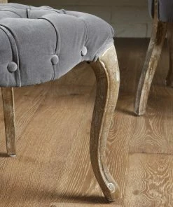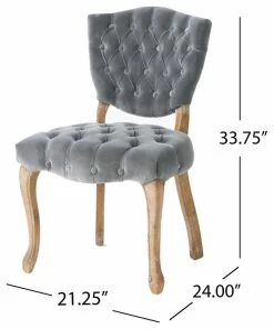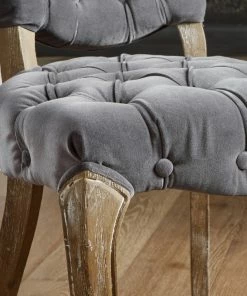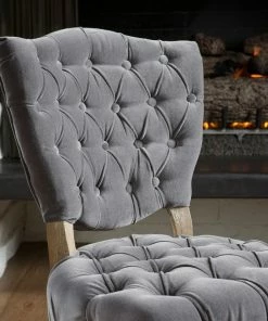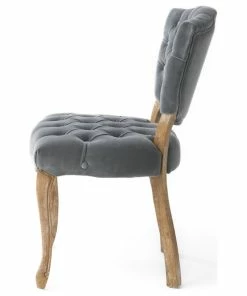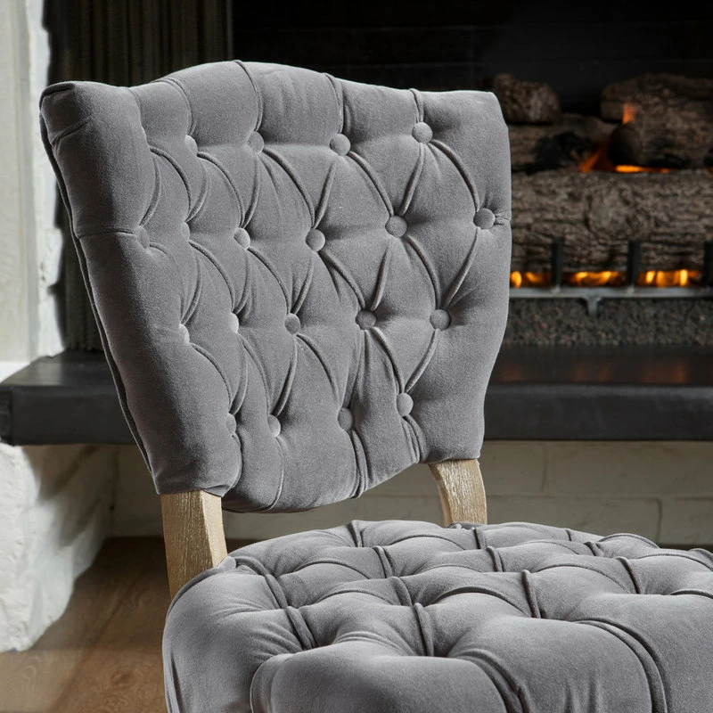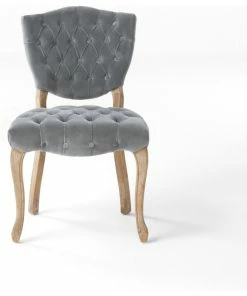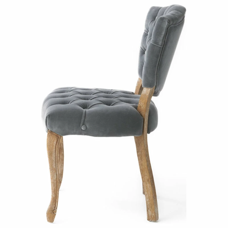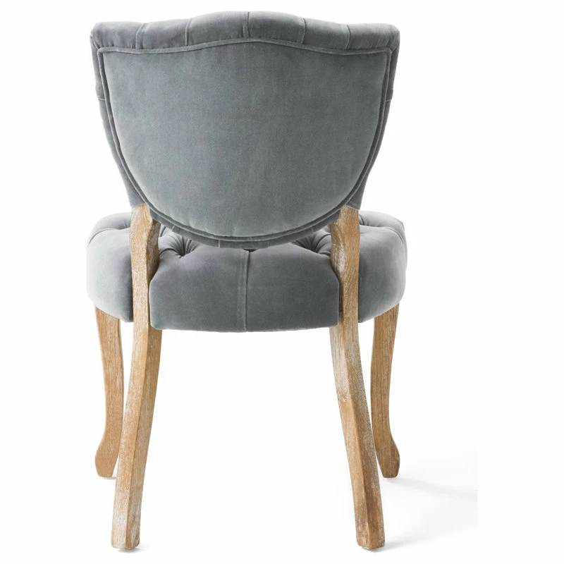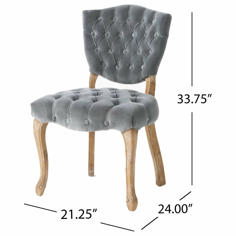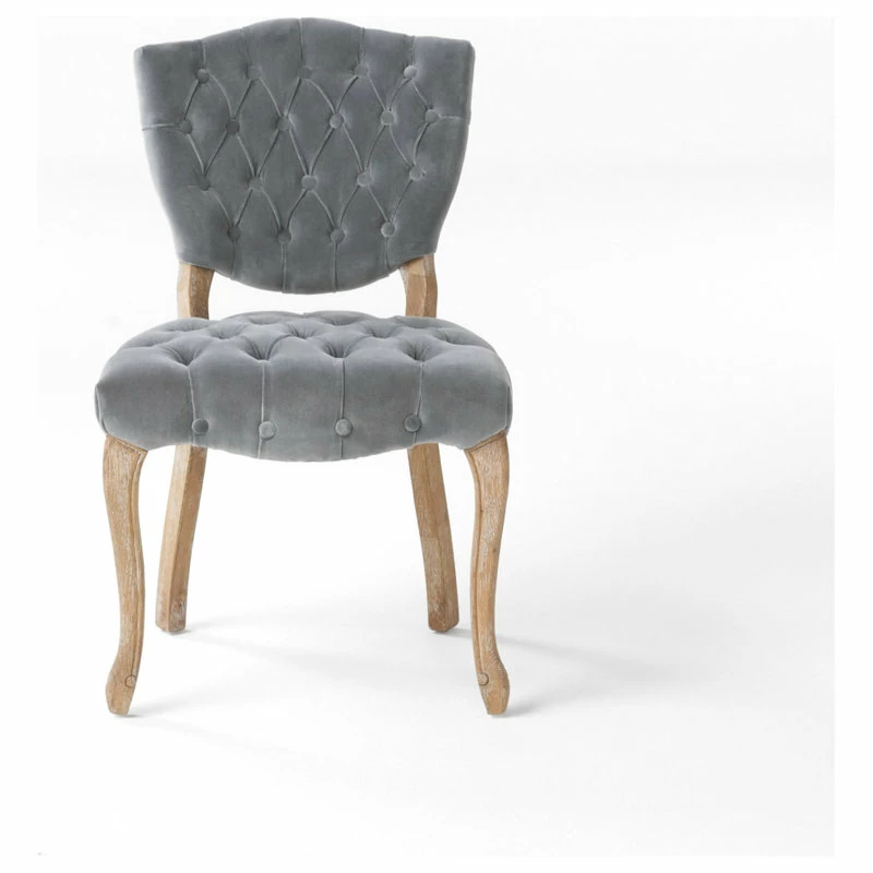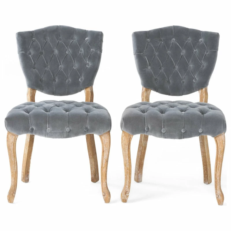 For a French-inspired sophistication and style, look no further than the Violetta tufted velvet fabric dining chairs. This set of two chairs features ample tufting, a solid weathered oak frame and intricately carved wooden cabriole legs.