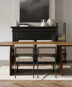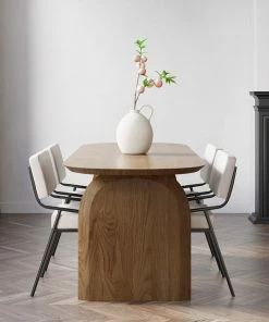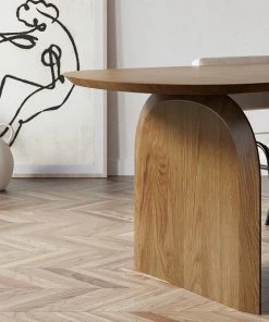 The countertop of dining table is designed in a flattening oval shape, a cross between an oblong and an oval shape, as per the experts. The delicate, circular contours of the wooden frame provide a stunning contrast with the natural hue of the wall, making it seem rich.