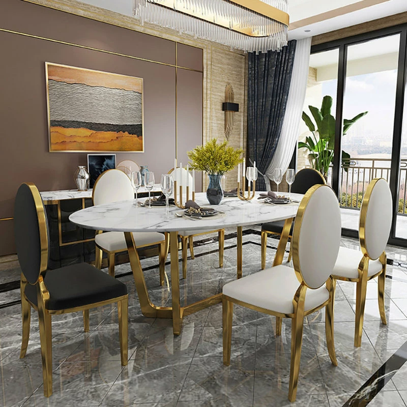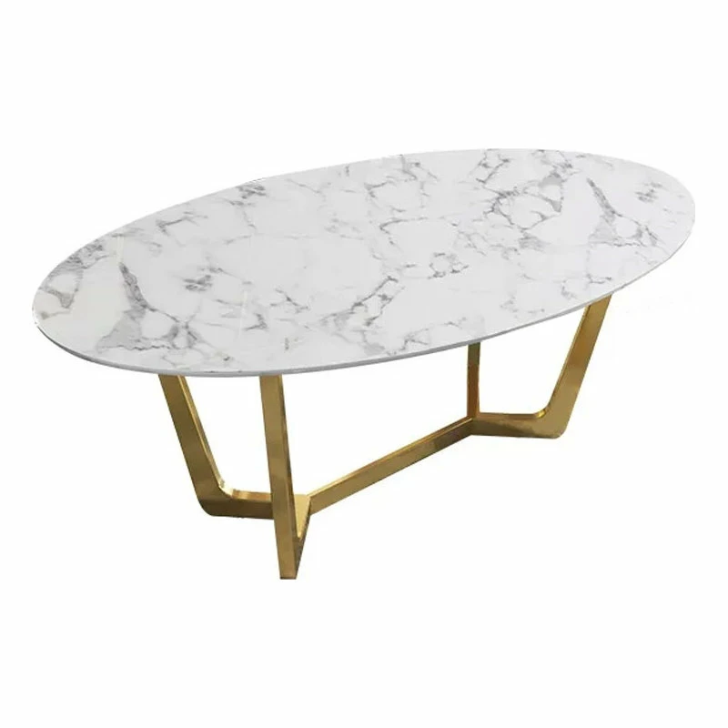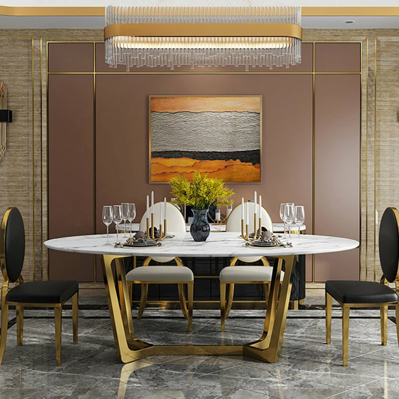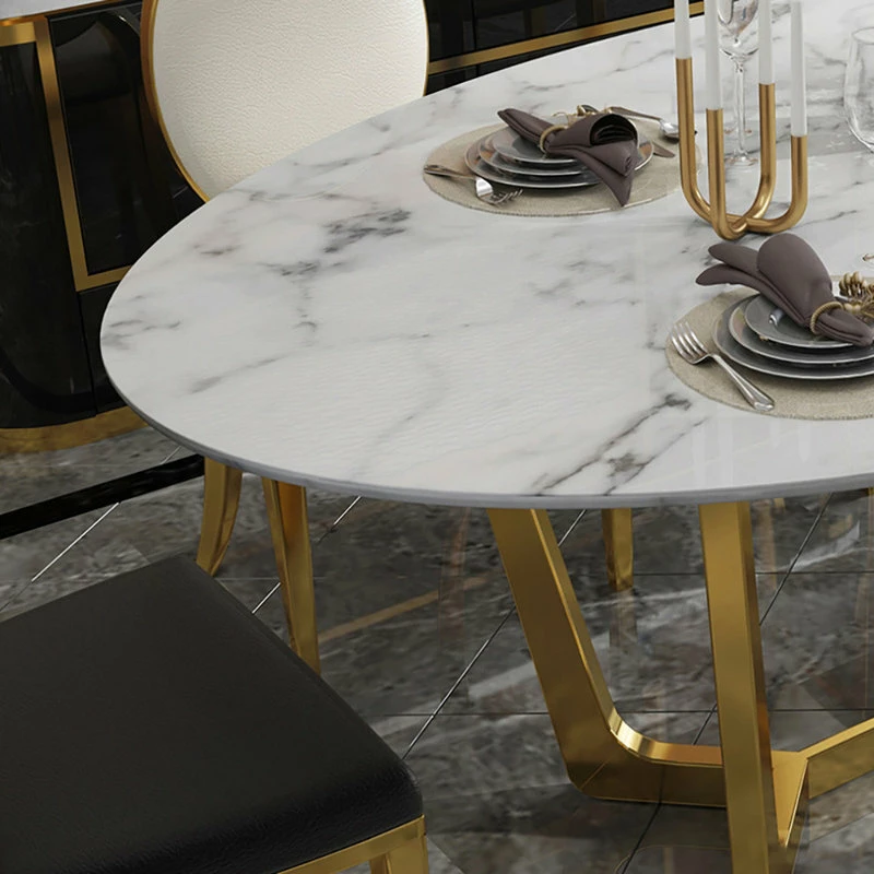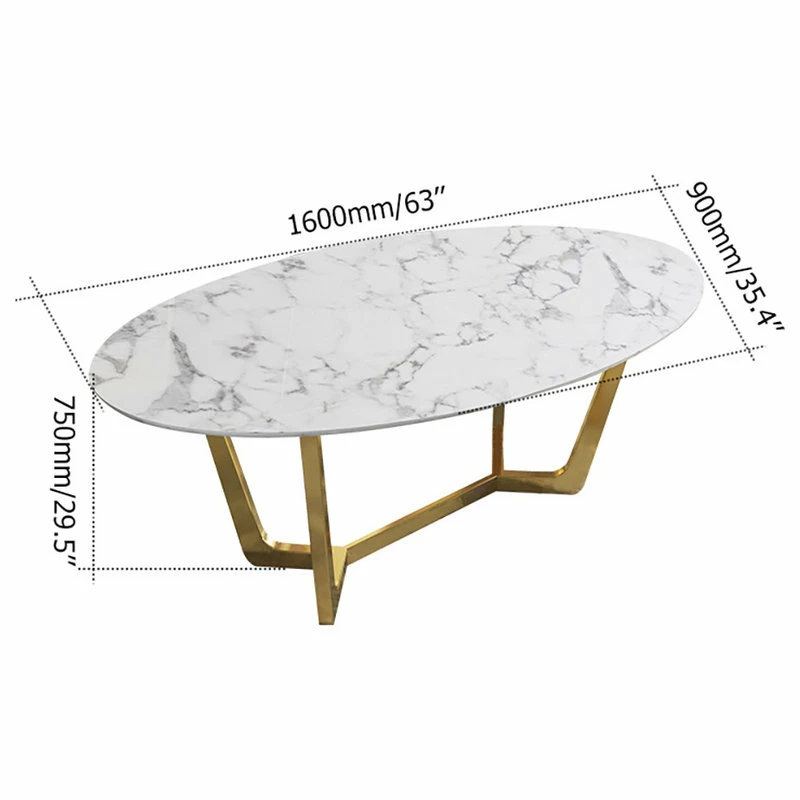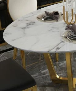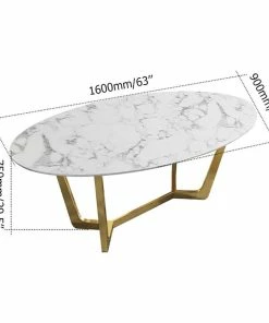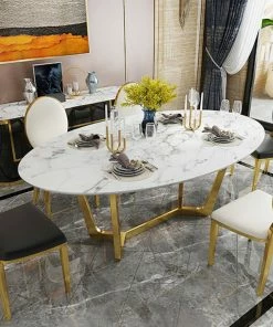 Featuring the modern style, this dining table is the perfect addition to improve your lifestyle. Oval-shaped tabletop is designed to showcase the beauty of faux marble, which will bring you an earthy yet graceful touch. While the trestle base reinforce its aesthetics with clean lines and gleaming gold hue. Durably constructed of high-quality materials, it’s sure to be a chic and functional addition to your dining room for years to come. Add visual interest and dimension to your dining space with this wonderful piece!