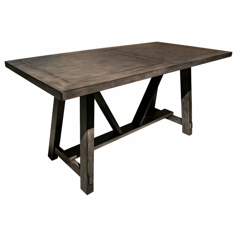Put the electronic devices down and gather your family and friends around this farmhouse-style dining table for good food and good old-fashioned conversation. The handsome table rests on a trestle-style base and features an attractive V-grooved border on the top. Itβs constructed of hardwood solids and birch veneers, with a lightly distressed dark carbon finish.,