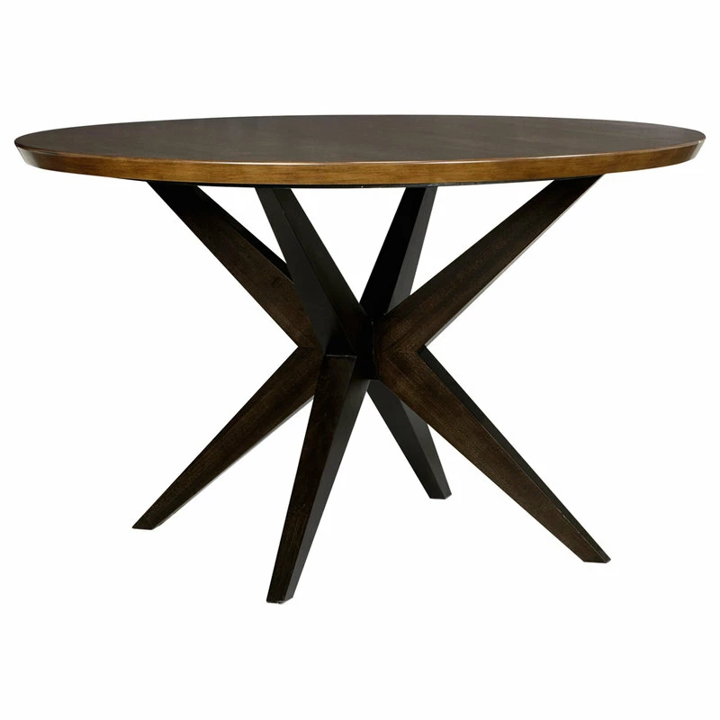 The Kateri round pedastal table has a minimalistic modern contemporary form paired with a wood species whose color variations and natural imperfections embrace the organic overtures present in modern interior design. The contemporary cross hatched legs offer interest to the simplistic finishing of the round top. A color pallet of rich Hazelnut and deep Ebony creates a harmony of tones that is both welcoming and inspiring to the soul. Crafted of Poplar Solids and Rustic Birch Veneer.