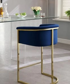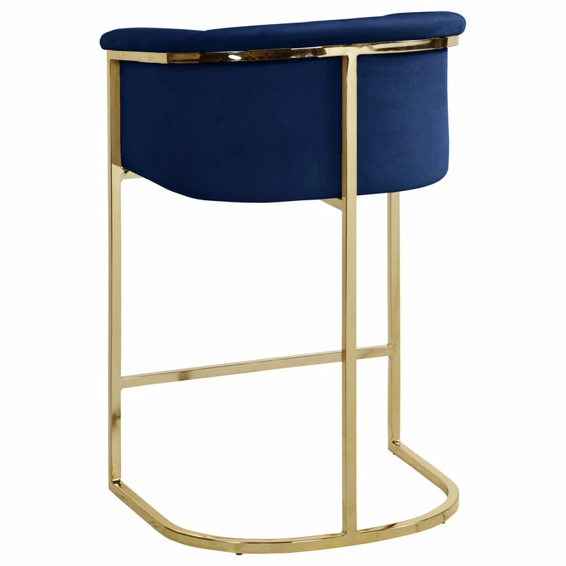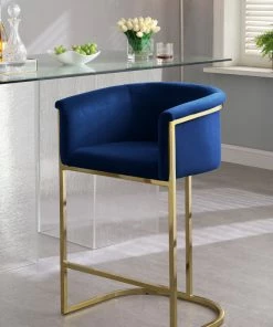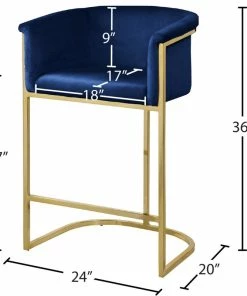 Complement your contemporary home furnishing with this Donatella Navy Velvet Stool from Meridian Furniture. Its curved design and rich beige velvet upholstery provides a comfortable, soft, luxurious seat for you to relax in, while also adding a touch of elegance to your living space. Its gold steel base adds the perfect balance to the stool’s fun navy color, in addition to holding the stool up to counter height and providing durable support for years to come.