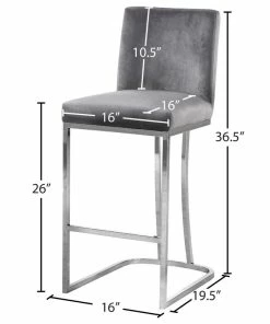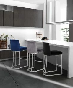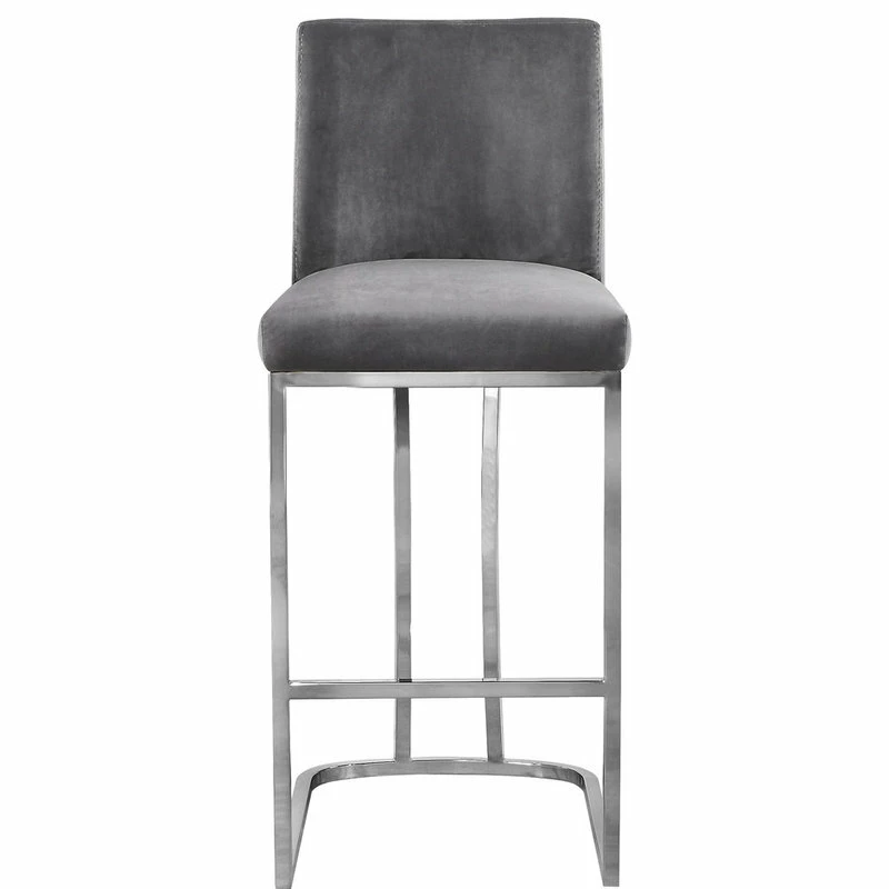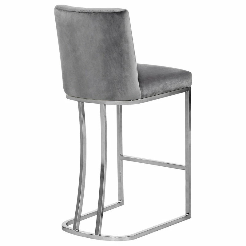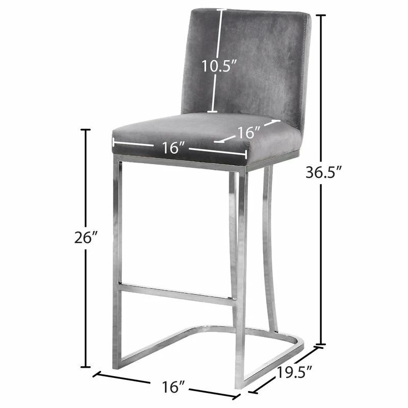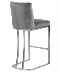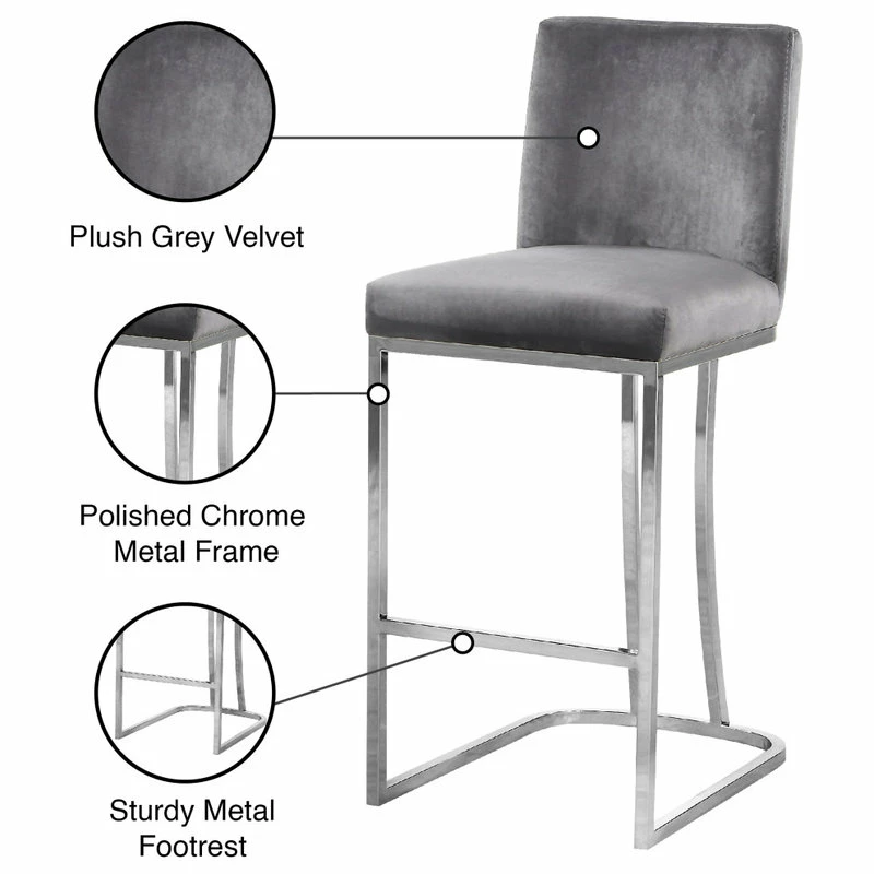 Make sure guests stay comfortable as they wine and dine from this Heidi Grey Velvet Stool. This stool has a sleek metal base finished in chrome for a chic look and is upholstered in sumptuous grey velvet for a touch of glam. The upholstery is top quality and has a sleek, velvety feel against the skin for a refined and elegant presentation. The armless design facilitates conversation, and a footrail on the bottom gives you a spot to rest your feet while you dine.