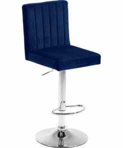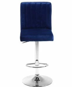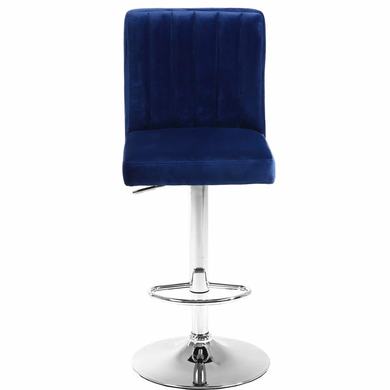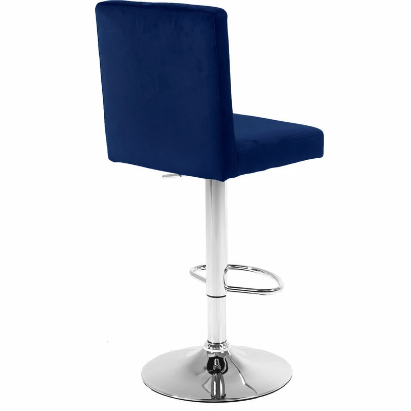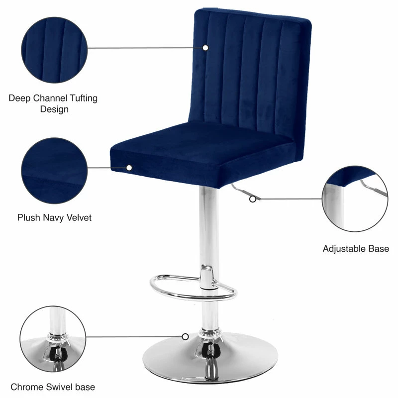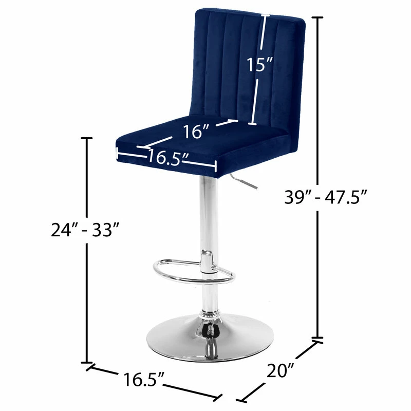 Relax in total comfort while sipping cocktails from this Joel Navy Velvet Adjustable Stool. Rich velvet upholstery gives this stool a luxe look that oozes glamour and sophistication with every turn. The chrome-finished base has a definitive modern edge, and a foot rail on the bottom gives you a spot to rest your feet while you unwind. Easily raise or lower the seat with just the touch of a lever to ensure custom comfort at the home bar or your kitchen counter.