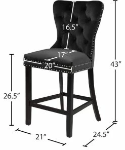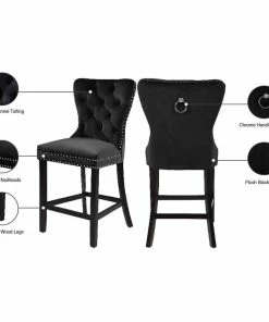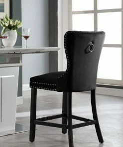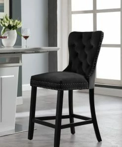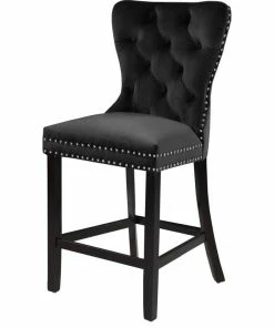Lounge in luxurious style with the Nikki black velvet counter stool. Featuring a curved high back, plush cushioned seat and deep tufted black velvet upholstery studded with chrome nailheads, this counter stool is sure to take your dining experience to a whole new level. Espresso wood legs provide sturdy support and complement the stunning black upholstery for a sleek, contemporary design.