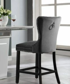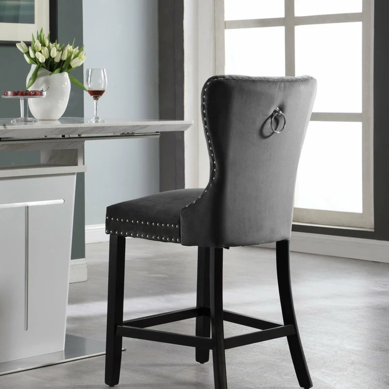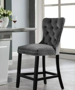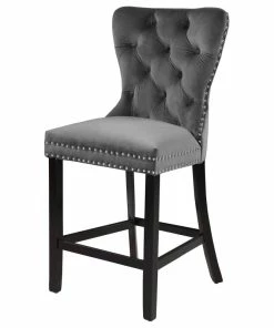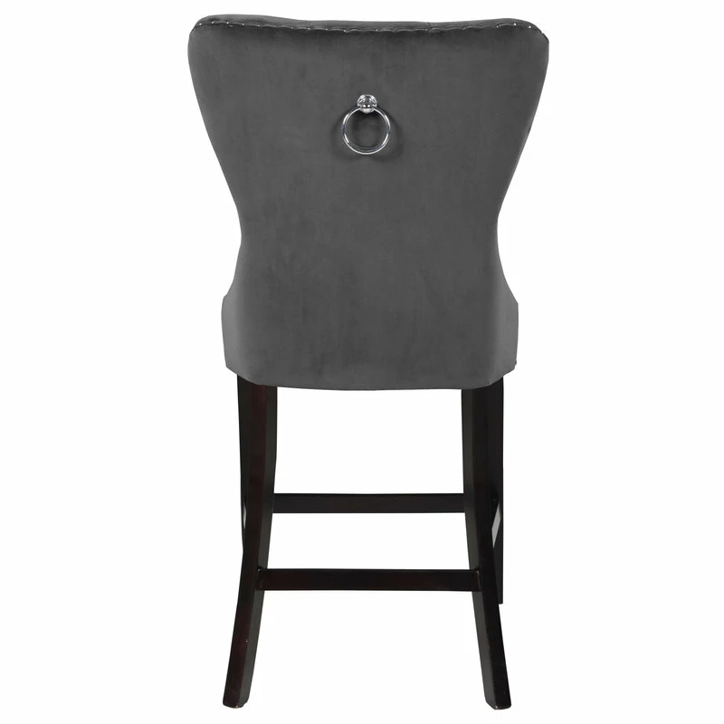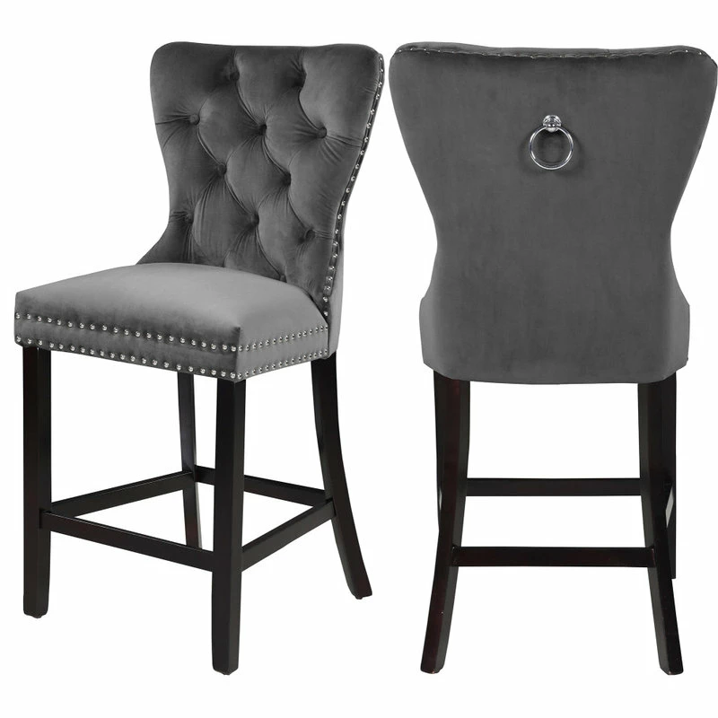 Lounge in luxurious style with the Nikki gray velvet counter stool. Featuring a curved high back, plush cushioned seat and deep tufted gray velvet upholstery studded with chrome nailheads, this counter stool is sure to take your dining experience to a whole new level. Espresso wood legs provide sturdy support and complement the stunning grey upholstery for a sleek, contemporary design.