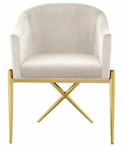 Spread elegance and modernity to your dining room with this Xavier Cream Velvet Dining Chair from Meridian Furniture. This beautiful chair features a simple barrel seat with a plush cushion and back, ensuring that every meal is a comfortable one. The gold steel legs provide durable support while you sit, and an “X” leg in the back lends the chair an uber-modern vibe. Gold finishing on the base is sleek and chic, giving this chair a contemporary edge that’s well at home in any modern dining room. Sleek cream velvet upholstery is durable and tough yet soft against your body, elevating meal times to a luxurious experience.
