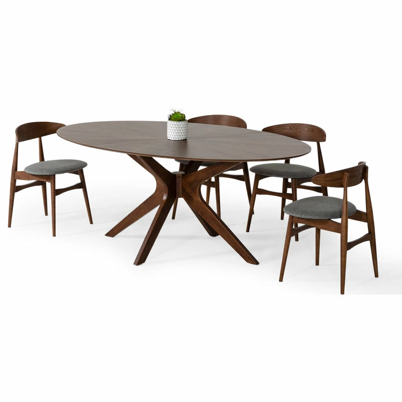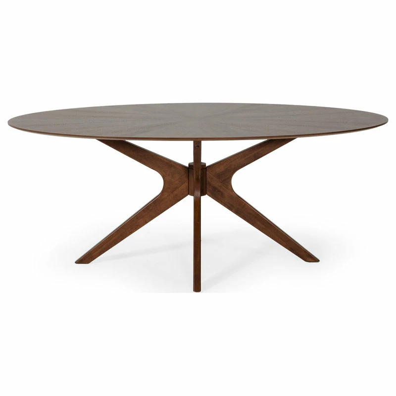 The Beck dining table is a stunning, oval shaped statement piece that comfortably invites up to eight people to gather around. The deep walnut finish and tapered legs lend an industrial, midcentury feel to any room, while the x-shaped base anchors its design in a classic, contemporary silhouette. Hidden in the details, the beveled edge adds a touch of luxury to this already beautiful piece, priming it for every occasionโfrom big family meals to overdue reunions.