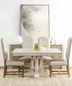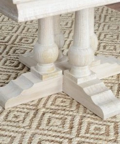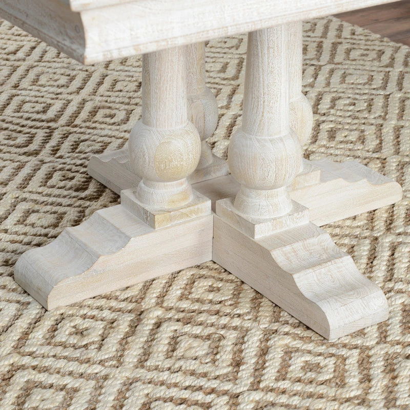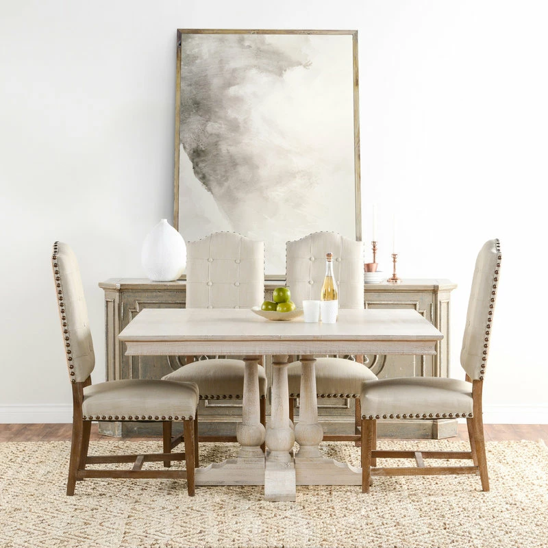 Let the Della dining table be your exquisite canvas for your favorite sumptuous meals. With its off-white mango wood and charming wood grain finish, this French country style table makes a fresh and inviting addition to your home. Stately yet pastoral with a unique trestle base, this space-for-eight table is sure to please family, friends, and even your most discerning dining guests.