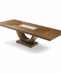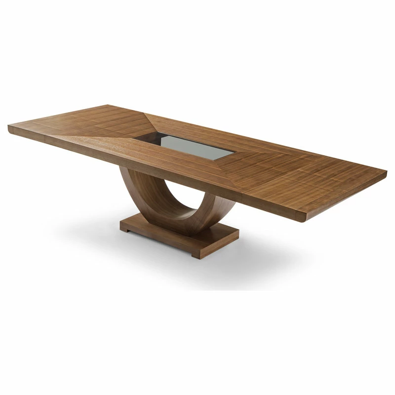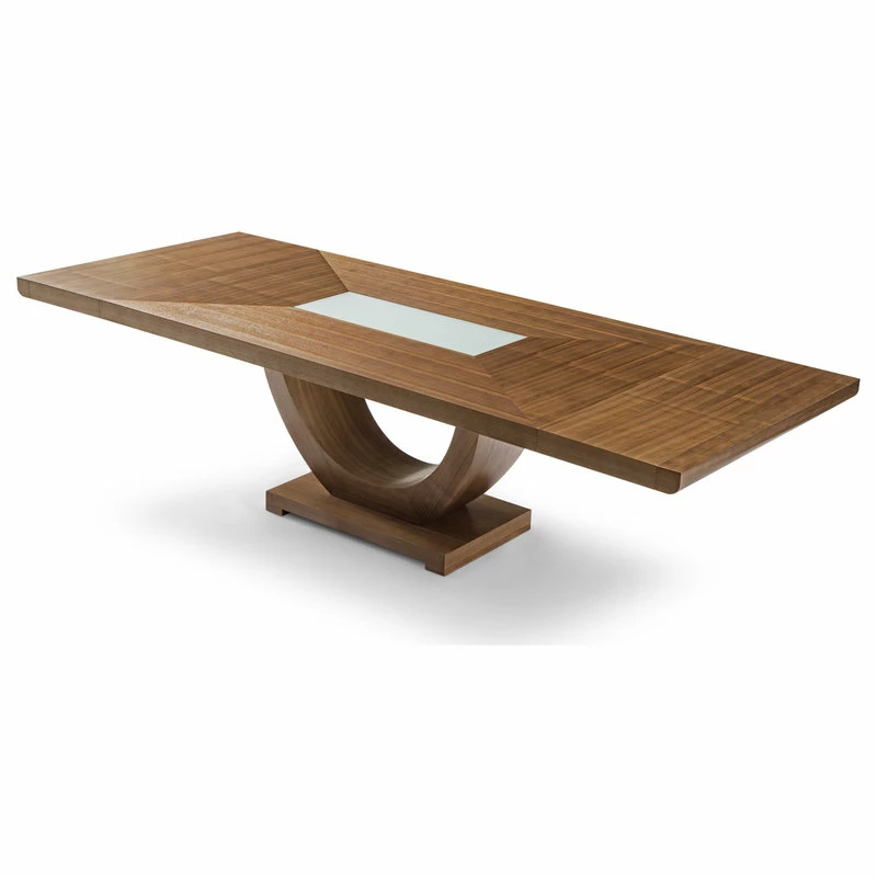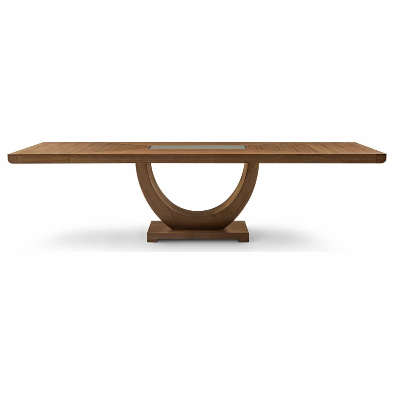 Balanced effortlessly atop a stunning curved base, the Heiwa Dining Table emulates a contemporary sculpture and a feeling thatβs both inspiring and calming. This sophisticated yet inviting combination of curves, clean lines, and inset glass create a harmonious design suited for formal or everyday dining. When opened to its full length, this extendable table with collapsible leaves comfortably seats up to 10 people.