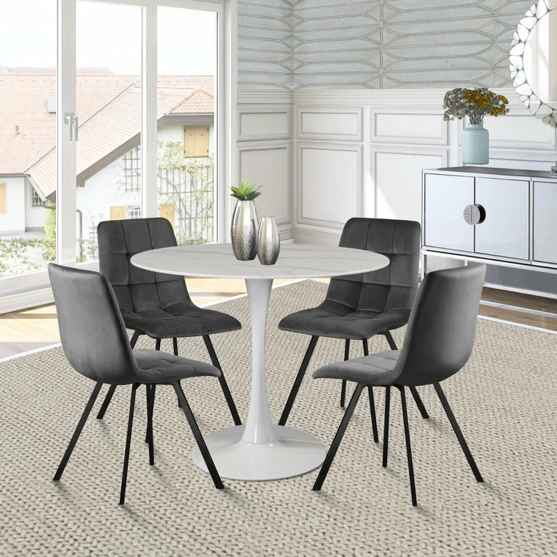 SKU: 974-T Categories: Dining Tables, Kitchen & Dining Furniture Tags: 10mm thick glass with marble veneer, 36" round faux marble dining table, Contemporary, Contemporary design, Dining table, Elegant, Furniture, Modern, Rich gold base, Upholstered, Velvet