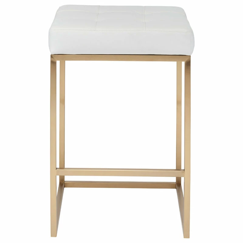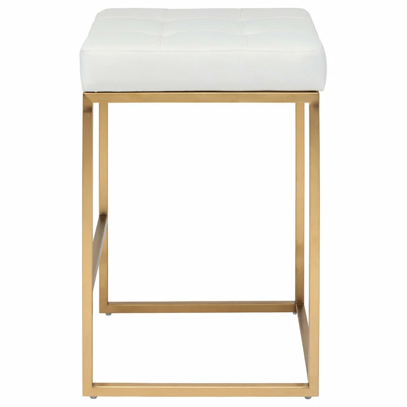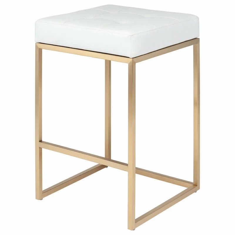 The Chi counter stool is an ideal example of simple elegant modern design. The brushed gold stainless steel frame, including fixed foot rest, uses a bare minimum of materials in its construction creating an exceptionally light effect. The stool is topped with a dense form fitting white naugahyde seat cushion for added comfort.