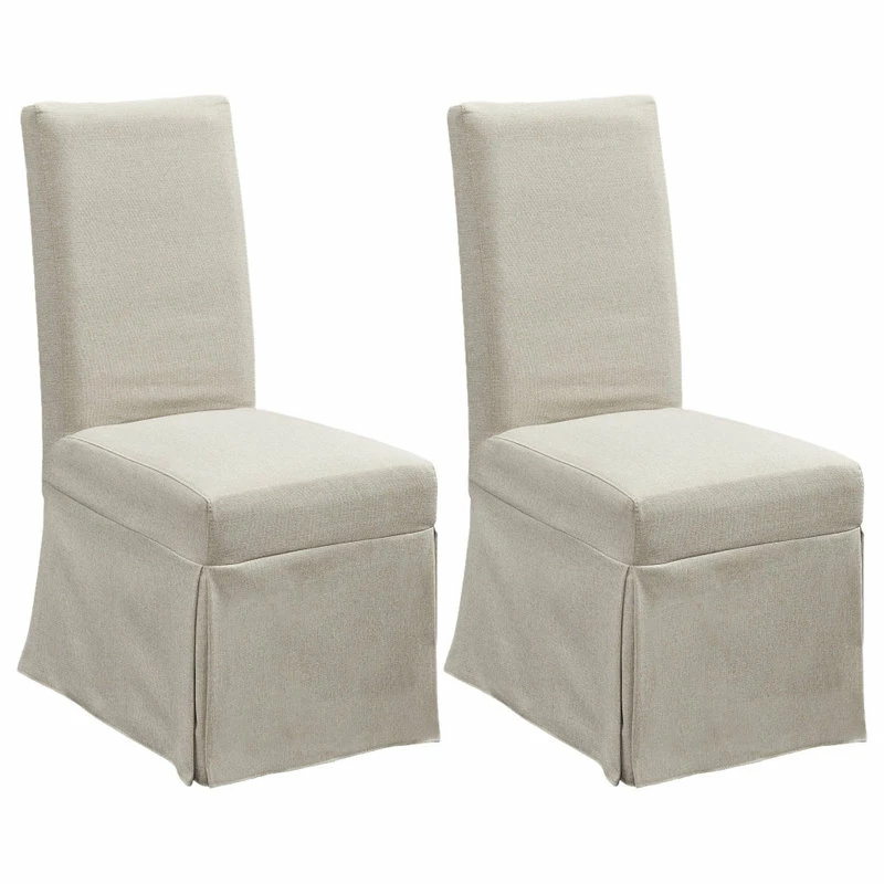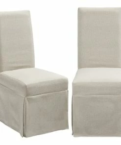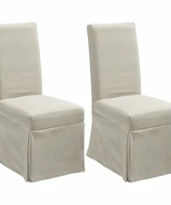 Standing tall and elegant with its high back, the Muse Upholstered Chair bring luxury to your dining space. The chairs are made from solid rubberwood, polyester fabric and topped with a off-white linen color cover with lace detailing on the back. With sophisticated design, the Muse Upholstered Chair uses comfortable elegance to help you and your guests feel right at home.