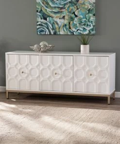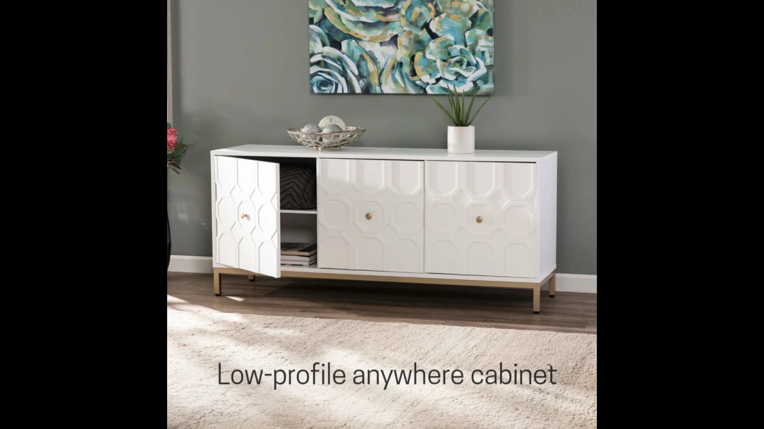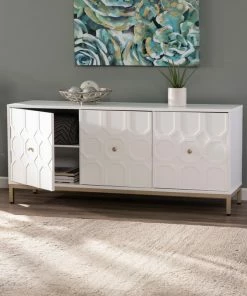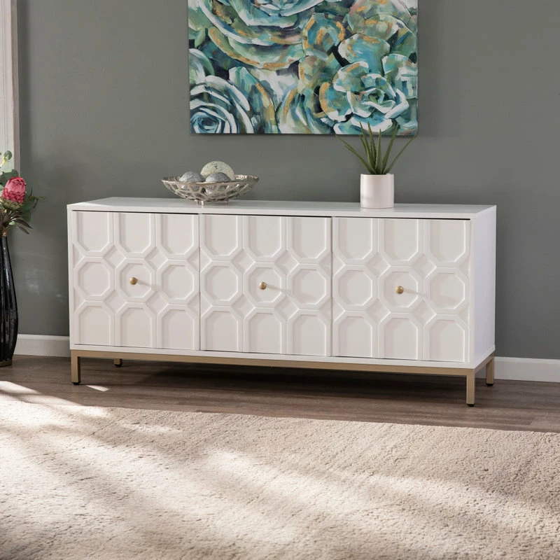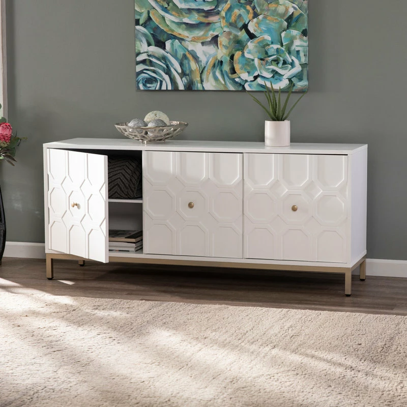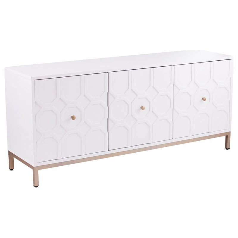 Carve out storage space with this accent cabinet. Ample shelving awaits behind handsome, Moroccan style carved doors, ready for your stemware, board games, or movie list. Contrasting hardware and metal base add a touch of color to the fresh white, low-profile silhouette. Swing wide with this anywhere cabinet beneath your wall mounted TV or anchoring your dry bar in your open concept entertainment space.