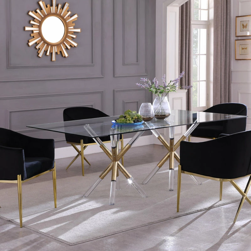Some things are meant to stand out. Behold the iconic, eclectic, Heliosβan impressive dining-room addition that would look equally at home in any art museum. Topped with an elegantly designed, solid glass surface, this table has a gravity that pulls guests in and keeps them gathered for hours on end. The real conversation starter? Its enchanting acrylic and gold legs that speak for themselves.