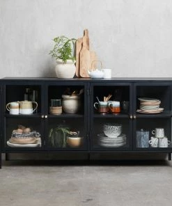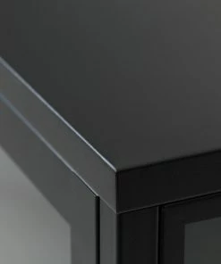 Enjoy a more refined take on the modern design aesthetic with this metal and glass sideboard. This metal four door cabinet is designed with four glass panel door fronts, two shelves, and simple black metal framework, making it the perfect home for your favorite pottery, books, and other collected curiosities. The design is timeless and complements any range, color or texture so feel free to mix it up with both natural wooden colors, darker smoked stains and bold colors from fabrics or simply use it as a โstand-aloneโ statement piece. The cabinet has five year commercial warranty.
