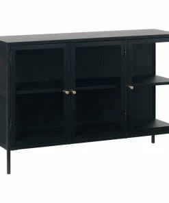 Enjoy a more refined take on the modern design aesthetic with this metal and glass sideboard. This metal four door cabinet is designed with four glass panel door fronts, two shelves, and simple black metal framework, making it the perfect home for your favorite pottery, books, and other collected curiosities. The design is timeless and complements any range, color or texture so feel free to mix it up with both natural wooden colors, darker smoked stains and bold colors from fabrics or simply use it as a โstand-aloneโ statement piece. The cabinet has five year commercial warranty.