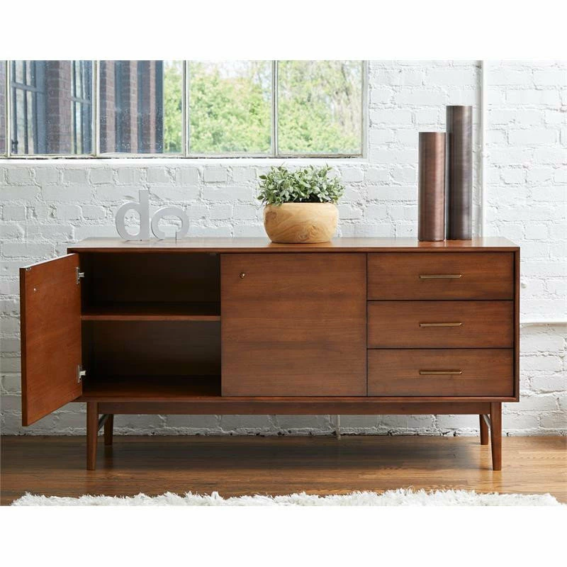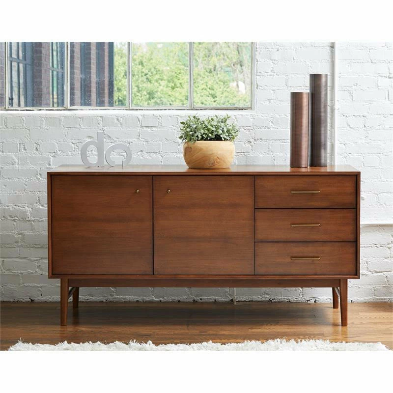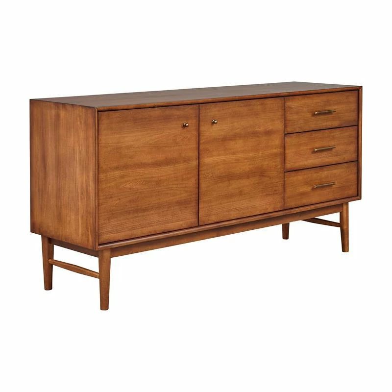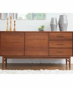 A trendy buffet with a contemporary and modern look, this modern style buffet gives you functional storage and very simple lines, so you can now get that sleek look for your living area. Three drawers and two storage compartment makes storing easy. Since the piece itself is lower, the top is within easy reach and large enough to hold lots of things. It’s a favorite place for decorative items and those memorable collectables. The piece is crafted with durability and longevity in mind and the manufacturer prides itself in making furniture that last generations