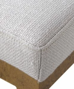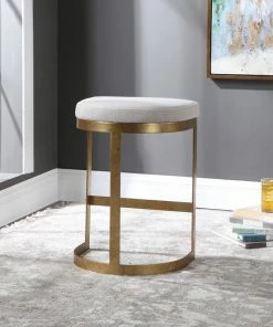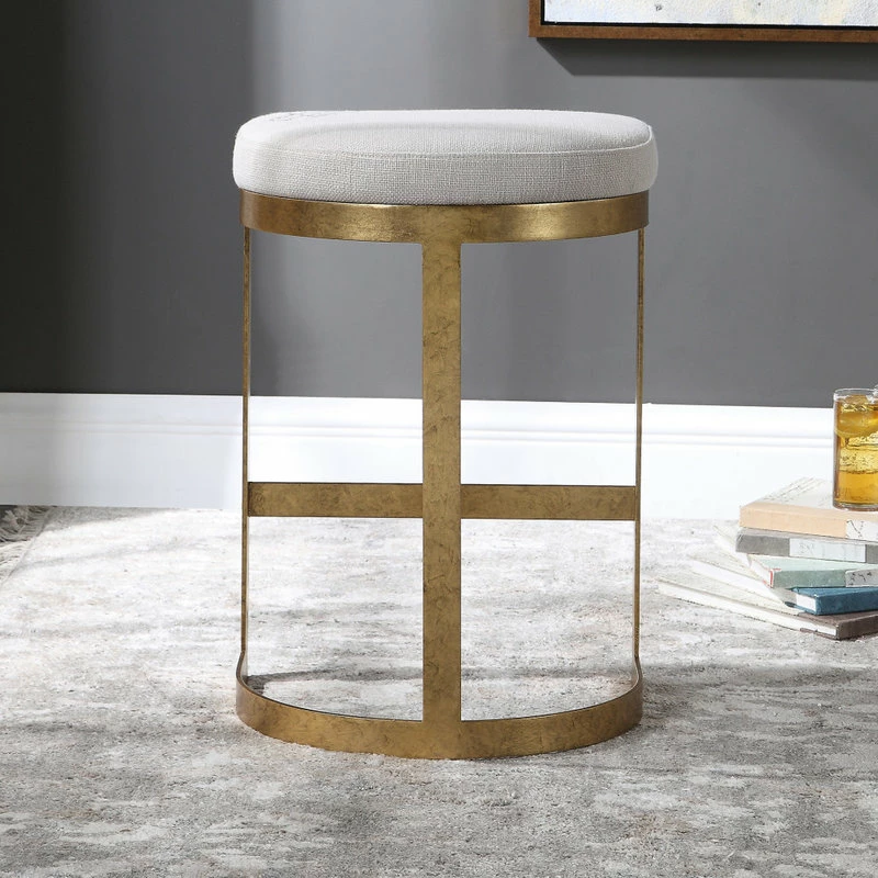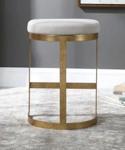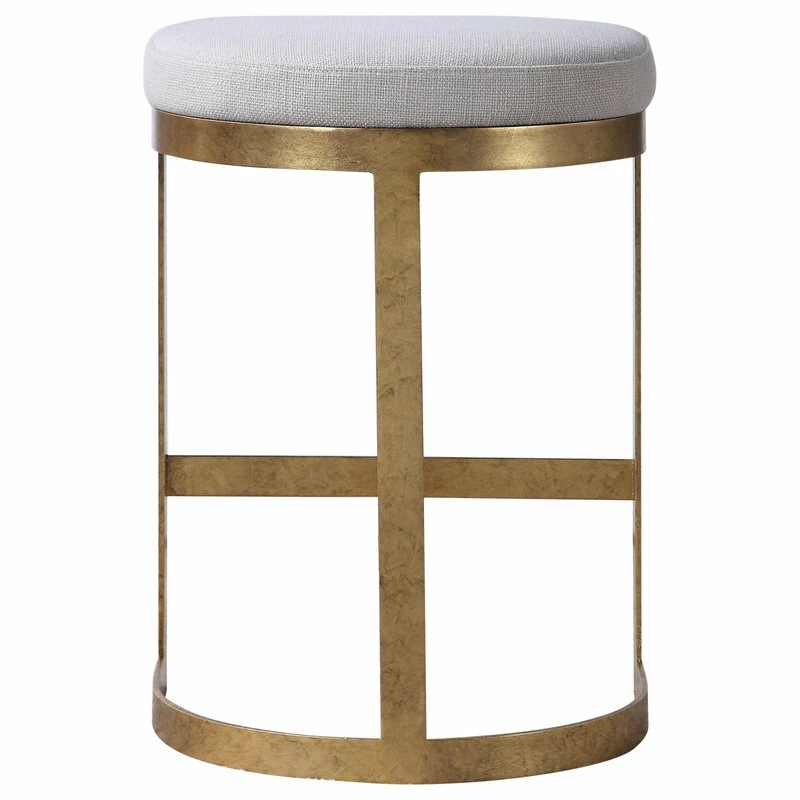 Simplistic But Sturdy, This Statement Counter Stool Features A Thick Hand Forged Iron Base Finished In A Mottled Antique Gold Leaf. Plush Seat Is Tailored In An Off-white Linen Blend Fabric. Seat Height Is 26″.