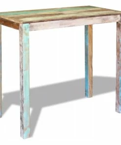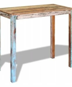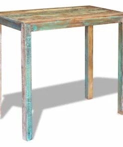 This antique-style wooden bar table will make a unique addition to your home. Its solid wood construction makes it stable, sturdy and suitable for everyday use. It can also be used as a dining table or breakfast bar. This vintage table is made of solid reclaimed wood, which means that every piece of furniture is unique and slightly different from the next. Furniture made from reclaimed wood has the characteristics of different woods like teak, mango wood and acacia. Reclaimed wood is solid, stable, durable, and beautiful. Signs of wear and visible grain structure give each piece its own history and a unique look. The bar table is fully handmade, and the craftsmanship adds to its spectacular retro style. Every step of the process is carried out with the greatest care, be it recombining, polishing, painting or waxing. Important note: colors vary from piece to piece, making each of our bar tables unique. The delivery is random.