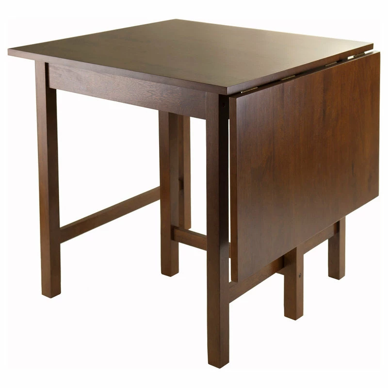 Lynden Drop Leaf Dining Table is functional and space saving perfect for kitchen or small area. Daily use table top surface is 29.92 square. For extra space, this table includes a Drop Leaf with surface area of 17.95’W x 29.92D. Fully Expand table surface is 47.87W x 29.92D x 29.53H. Slide out leg to prop up drop leaf. Contracted from solid wood in Antique Walnut Finish. Assembly Required.
